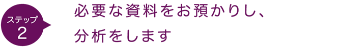 経営状態や取引先、社内の規定など現状分析に必要な資料を確認し、担当コンサルタントによる解析を進めます。その後、分析結果をまとめてレポートを作成、今後の進め方を確認・調整していきます。