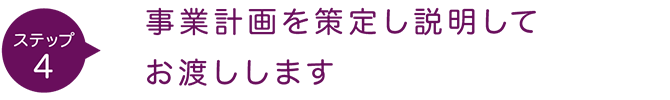 現状分析と再面談での話し合いによる方向性を受けてBESTな事業計画書を作成します。具体的な内容・展開に踏み込み、スケジュールや事業の推進体制、費用等も提示しながら、スタートに向けて機運を高めます。