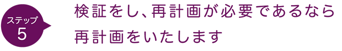 事業を進める中で、短期・中期目標等に照らし合わせ随時検証を実施します。状況の変化等により目標との大きなズレが生じたり方向性の転換が必要となるなど、計画の見直しが必要なときは、再度分析を進め計画を立案いたします。